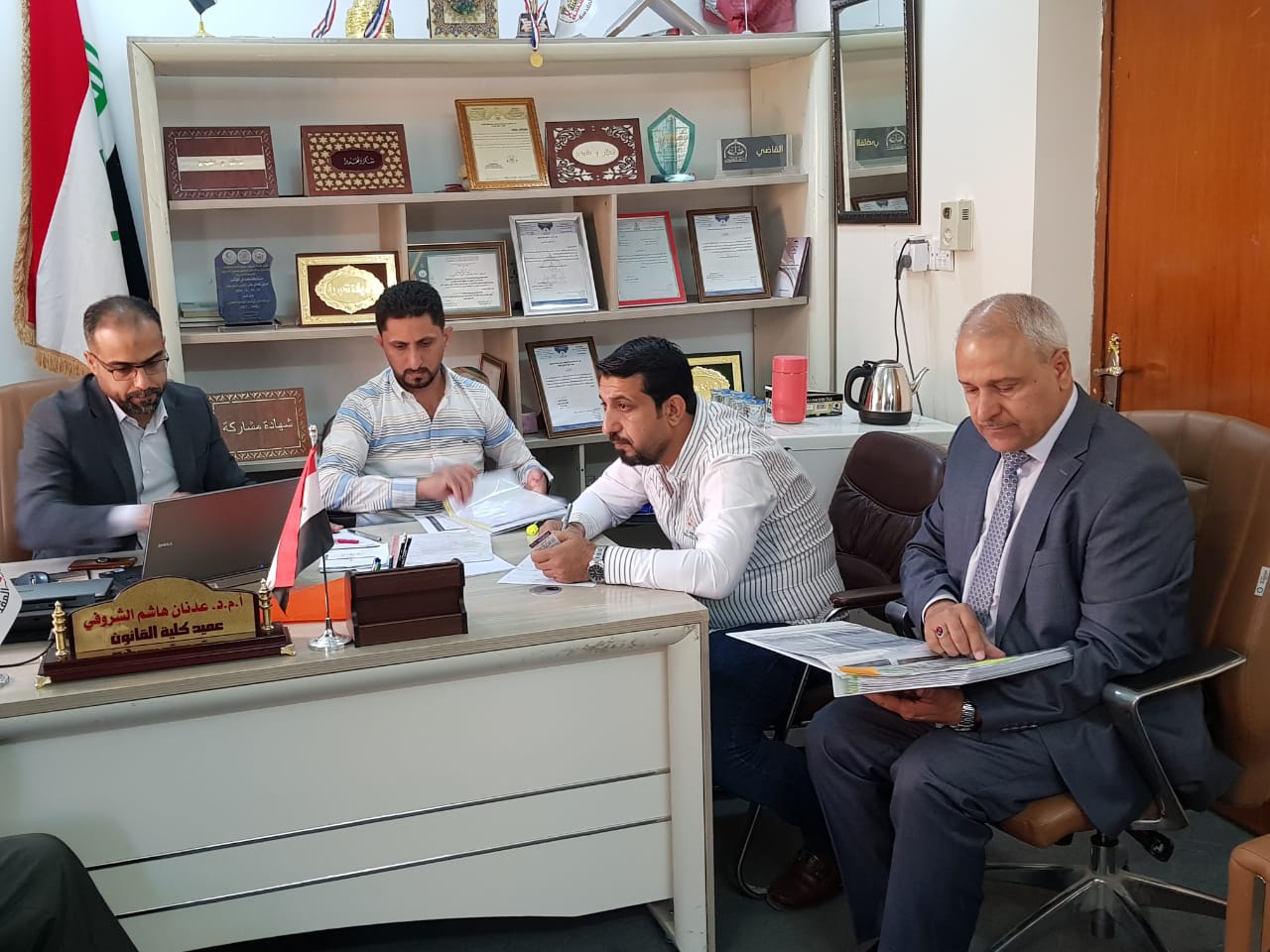 استقبل السيد عميد كلية القانون  الاستاذ المساعد الدكتور عدنان الشروفي في مكتبه هذا اليوم وفد من جامعة كربلاء برئاسة الاستاذ الدكتور أحمد كاظم اليساري مدير مركز الدراسات الاستراتيجة بصحبته الاستاذ المساعد الدكتور حمد جاسم الخزرجي رئيس قسم ادارة الازمات والمدرس المساعد حسين باسم رئيس قسم الدراسات السياسية والمدرس الدكتور فراس حسين علي الصفار باحث في مركز الدراسات الاستراتيجية حيث اعبر السيد العميد عن مدى سعادته بهذ الزيارة وسط التعاون العلمي بين الجامعتين حيث ستكون هنالك ورش وندوات ومؤتمرات علمية بالتعاون مع الجامعتين
