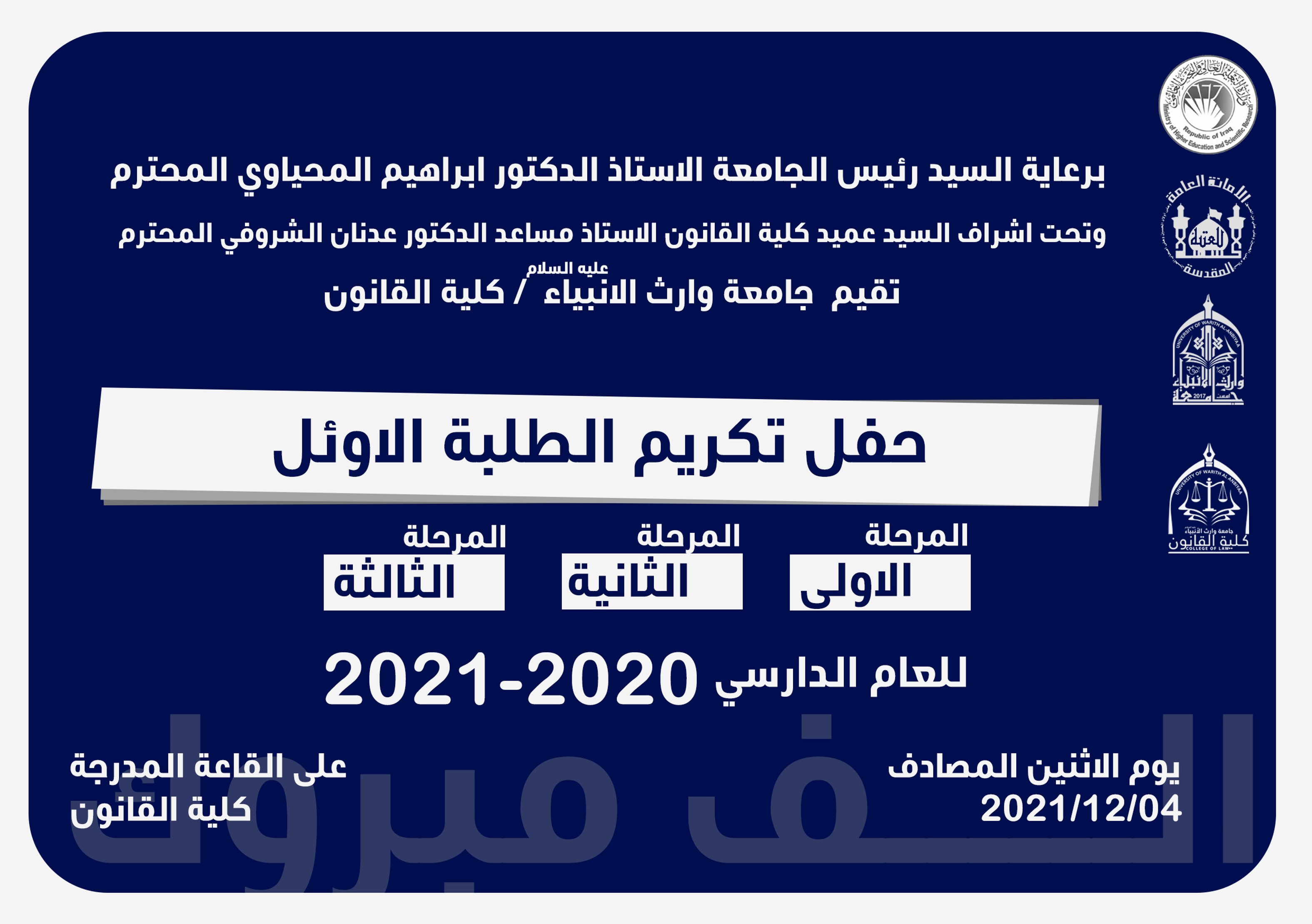 وتحت اشراف السيد عميد كلية القانون الاستاذ مساعد الدكتور عدنان الشروفي
