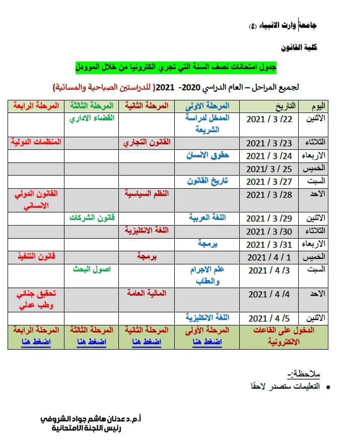 السلام عليكمالى/ طلبتنا الاعزاءم /إمتحان اللغة الانكليزياستنادا الى الاعمام الوارد الينا من مكتب السيد المساعد العلمي المحترم سيكونإمتحان تجريبي لجميع طلبة جامعة وارث الانبياء وكاتي:-1- جميع الطلبة الذين درسوا مادة اللغة الانكليزية في الفصل الاول يكونالامتحان لهم اجباري وتحتسب الدرجة من ضمن درجة السعي للمساعدة.2- الطلبة الذين لم يدرسوا اللغة الانكليزية سيكون الامتحان اختياري .3- يكون الامتحان عن طريق منصة المودل .4- موعد الإمتحان يوم الاثنين الموافق 15 \ 6 \ 2020 وعلى وجبتين : الوجبة الأولى من الساعة ) 11 - 10 ( صباح ا الوجبة الثانية ) 4 - 3( عصر ا5- يسمح للطالب بتادية الامتحانين .مع تاكيدنا على المشاركة الإجبارية لطلبة المرحلة الأولىعمادة كلية القانون