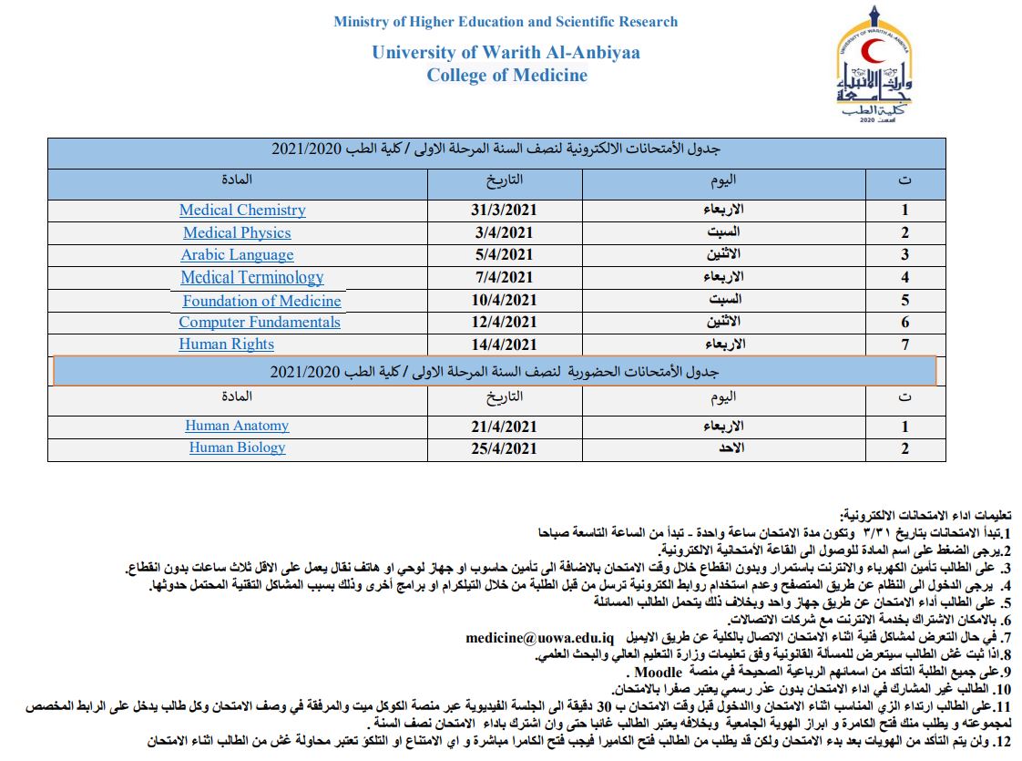 تم على بركة الله اليوم الأول من الامتحانات الالكترونية لكلية الطب جامعة وارث الأنبياء لنصف السنة للعام الدراسي 2020-2021 و باشراف السيد عميد الكلية الطب الأستاذ الدكتور فالح البياتي والسيد رئيس لجنة التعليم الالكتروني في الكلية الدكتور اسعد عباس. وتمت زيارة الغرفة المركزية في الكلية من قبل السيد رئيس الجامعة الأستاذ الدكتور طالب حسن الموسوي والسيد مساعد رئيس الجامعة للشؤون العلمية الأستاذ الدكتور عباس الدعمي والسيد رئيس قسم التعليم العالي الدكتور افضل الشامي .