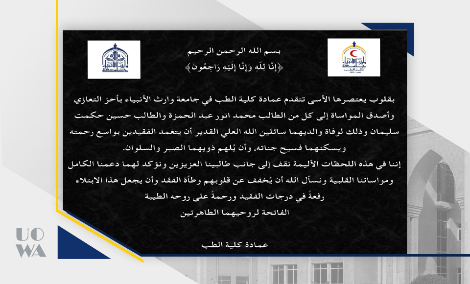 شارك عدد من طلبة كلية الطب في جامعة وارث الأنبياء (عليه السلام) ضمن الكوادر الطبية في مفارز مستشفى سفير الإمام الحسين (عليه السلام) التخصصي، لتقديم الخدمات الصحية والإسعافات الأولية لزائري الإمام الحسين وأبي الفضل العباس (عليهما السلام)، خلال مراسم تبديل الراية في الأول من محرّم الحرام.