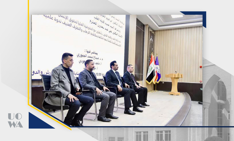 نظّمت جامعة وارث الأنبياء (عليه السلام)، بالتعاون مع المفوضية العليا لحقوق الإنسان – مكتب كربلاء، ندوة علمية بعنوان "التحصين الفكري ضد |الارها.ب والتط-رف الع-نيف"، وذلك بمشاركة كليتي (الطب والقانون) في الجامعة.