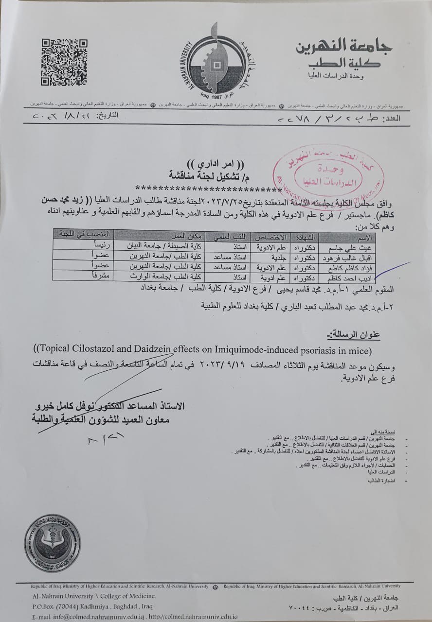 شارك الاستاذ الدكتور أديب أحمد الزبيدي رئيس فرع علم الأدوية عضواً ومشرفاً في لجنة مناقشة طالب الماجستير (زيد محمد حسن) في كلية الطب / جامعة النهرين الذي أشرف على بحثه الموسوم:Topical Cilostazol and Daidzein Effects on Imiquimod -Induced Psoriasis in Miceوقد تم قبول الرسالة بنجاح بدرجة امتياز