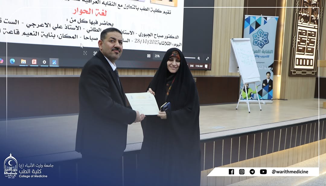 برعاية السيد رئيس جامعة وارث الأنبياء (ع) الأستاذ الدكتور إبراهيم الجياوي المحترم وبإشراف السيد عميد كلية الطب الأستاذ الدكتور علي عبد سعدون الغزي المحترم وبالتعاون مع النقابة العراقية للتطوير والتدريب أقامت كلية الطب ثلاث ندوات علمية تطويرية تهدف إلى تعزيز الوعي الأكاديمي والإنساني لدى الطلبة والتدريسيين وذلك صباح يوم الثلاثاء الموافق 28 / 10 / 2025 في قاعة الورش والدورات في بناية النعيماستُهلت الندوات بتلاوة سورة الفاتحة على أرواح شهداء العراق ثم عُزف النشيد الوطني العراقي وسط أجواء من الاعتزاز والانتماء الوطني والجامعي وقد تناولت الندوات محاور متعددة تمحورت حول قوة الكلمة ووعي الموقف ولغة الحوار وأهمية التواصل البنّاء في الحياة الجامعية والمهنية إضافة إلى محور الإسعافات الأولية الذي تضمن عروضاً عملية وتطبيقات ميدانية حول كيفية التعامل مع الحالات الطارئة قبل وصول الكادر الطبي ألقى الندوات كل من الدكتور صباح الجبوري والأستاذ مصطفى الطائي والأستاذ علي الأعرجي والأستاذة تسنيم الحداد الذين أثروا الحضور بمعلوماتهم وخبراتهم الميدانية وفي ختام الفعاليات قام السيد عميد كلية الطب الأستاذ الدكتور علي عبد سعدون الغزي بتوزيع الشهادات التقديرية على السادة المحاضرين تقديراً لجهودهم المتميزة في إنجاح هذه الندوات