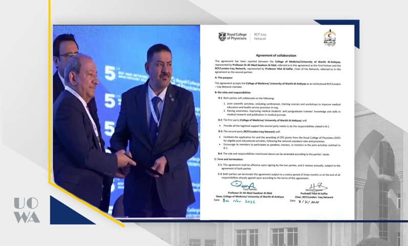 في إطار التوجه الاستراتيجي لكلية الطب جامعة وارث الأنبياء (ع) نحو الانفتاح الأكاديمي وتعزيز الشراكات العلمية الدولية مع المؤسسات المرموقة وحرصها على تطوير التعليم الطبي وفق أحدث المعايير الدولية وقّعت كلية الطب اتفاق تعاون علمي مع شبكة الكلية الملكية للطب (Royal College of Physicians / London-Iraq Network) وهي إحدى أبرز الشبكات المتخصصة بتعزيز التعليم الطبي المستمر ورفع كفاءة الأطباء والكوادر الأكاديمية في العراق والمنطقة.