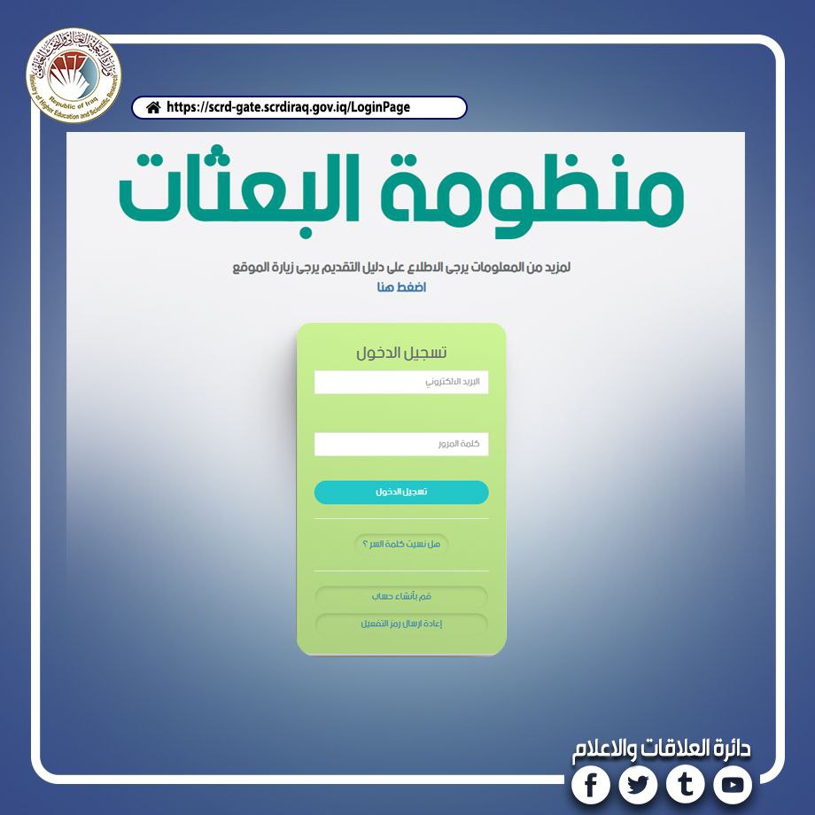 عملا بالبرنامج الحكومي وتأكيدا على تيسير الإجراءات وتبسيطها وتنظيم المسار الذي يتعامل به المواطنون مع الدوائر المسؤولة عن تقديم الخدمات تعلن وزارة التعليم العالي والبحث العلمي إطلاق منظومة التقديم إلى تقويم ومعادلة الشهادات لشعبة العلوم الطبية (https://scrd-gate.scrdiraq.gov.iq/LoginPage) للطبة الذين يرومون معادلة شهادات البكالوريوس اعتبارا من يوم الأحد الموافق 2023/4/2.
