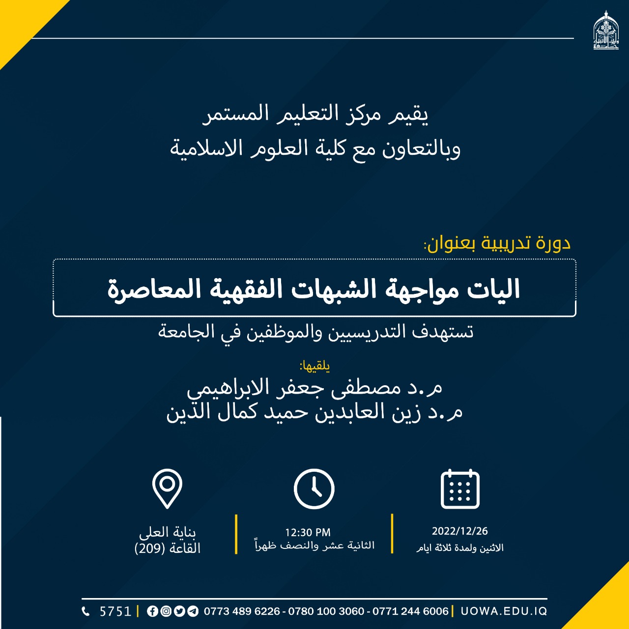 يقيم مركز التعليم المستمر في جامعة وارث الانبياء ع بالتعاون مع كلية العلوم الاسلامية دورة علمية تحت عنوان: (آليات مواجهة الشبهات الفقهية المعاصرة)