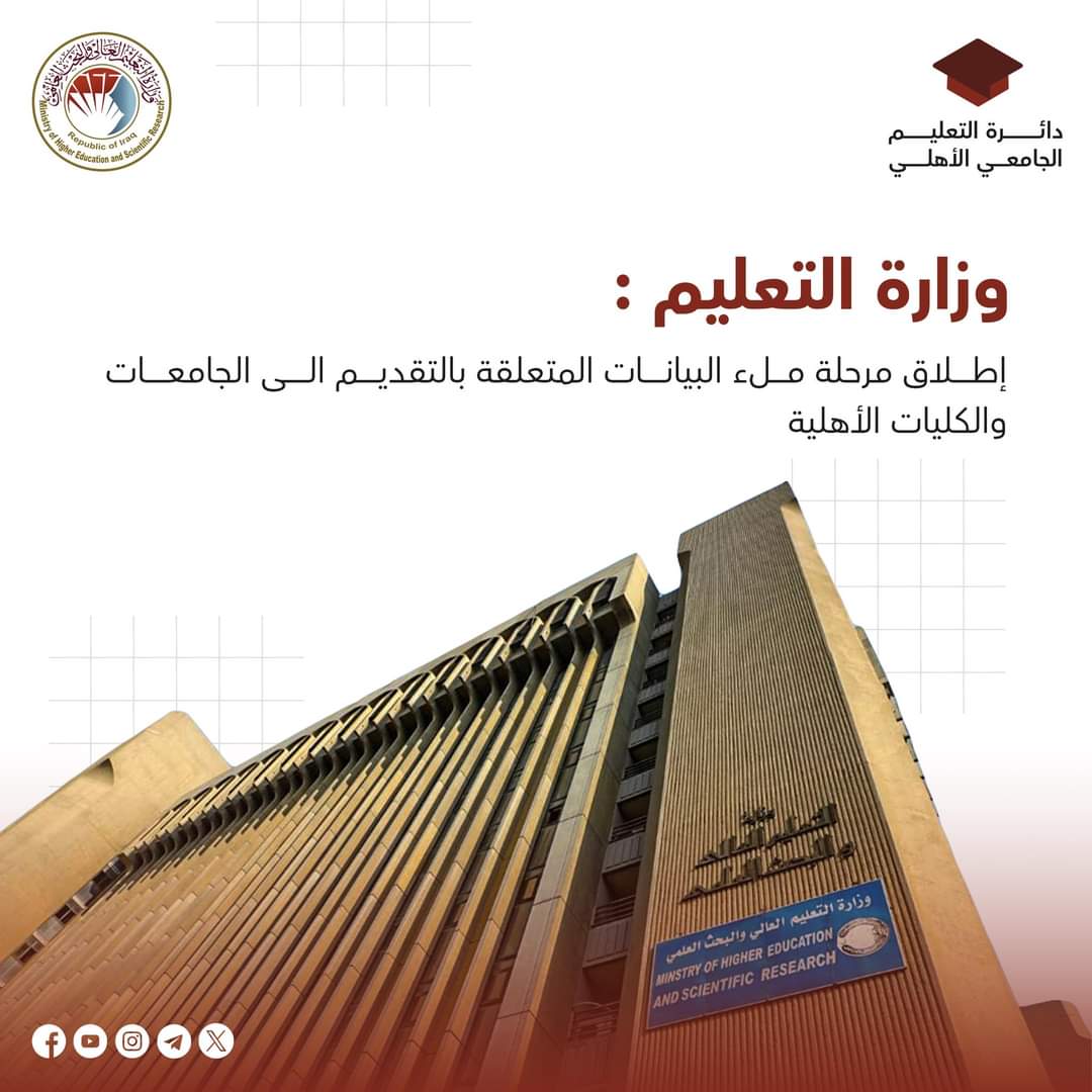 تم اطلاق مرحلة ملء البيانات  وتفعيل القنوات الخاصة المتعلقة بالتقديم الى الجامعات الاهلية العراقية.