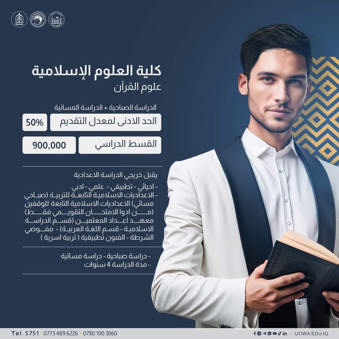شمولكم بالتقديم على كلية العلوم الإسلامية قسم علوم القرآن ،وقسم الفقه واصوله في جامعة وارث الانبياء(عليه السلام).