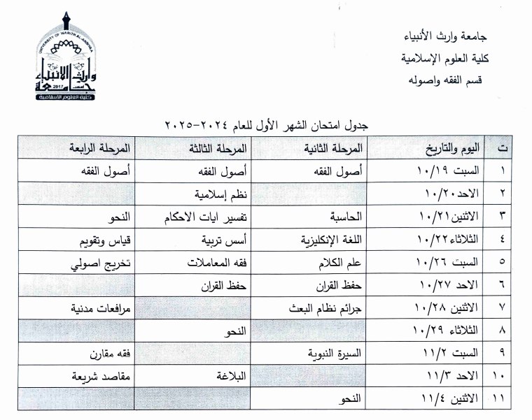 جدول امتحان الشهر الأول لقسم الفقه وأصوله للعام 2024-2025 الملاحظات: 1. الالتزام بالزي الموحد. 2. مدة الامتحان ساعة واحدة فقط. 3. لا يعاد الامتحان للطلبة المجازين الا بورقة مختومة من القسم. 4. كل من غش أو حاول الغش يعتبر راسبا في جميع المواد حسب التعليمات الامتحانية النافذة. مع تمنياتنا لكم بالتوفيق والنجاح