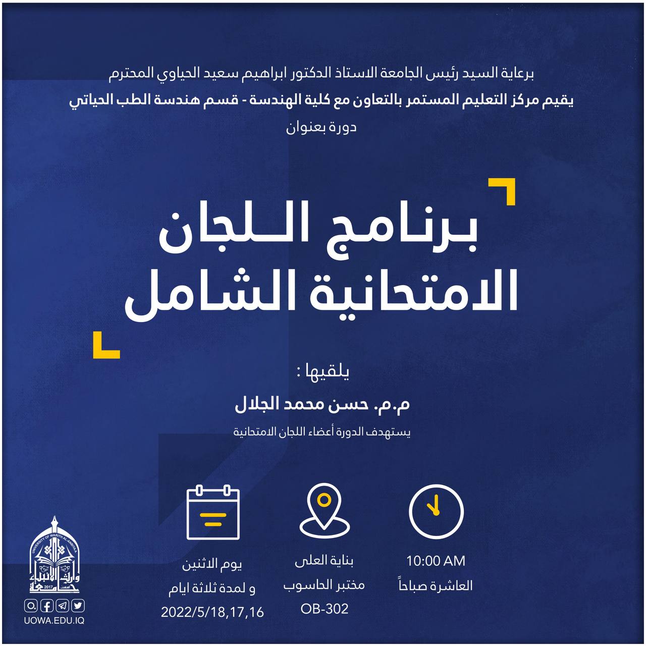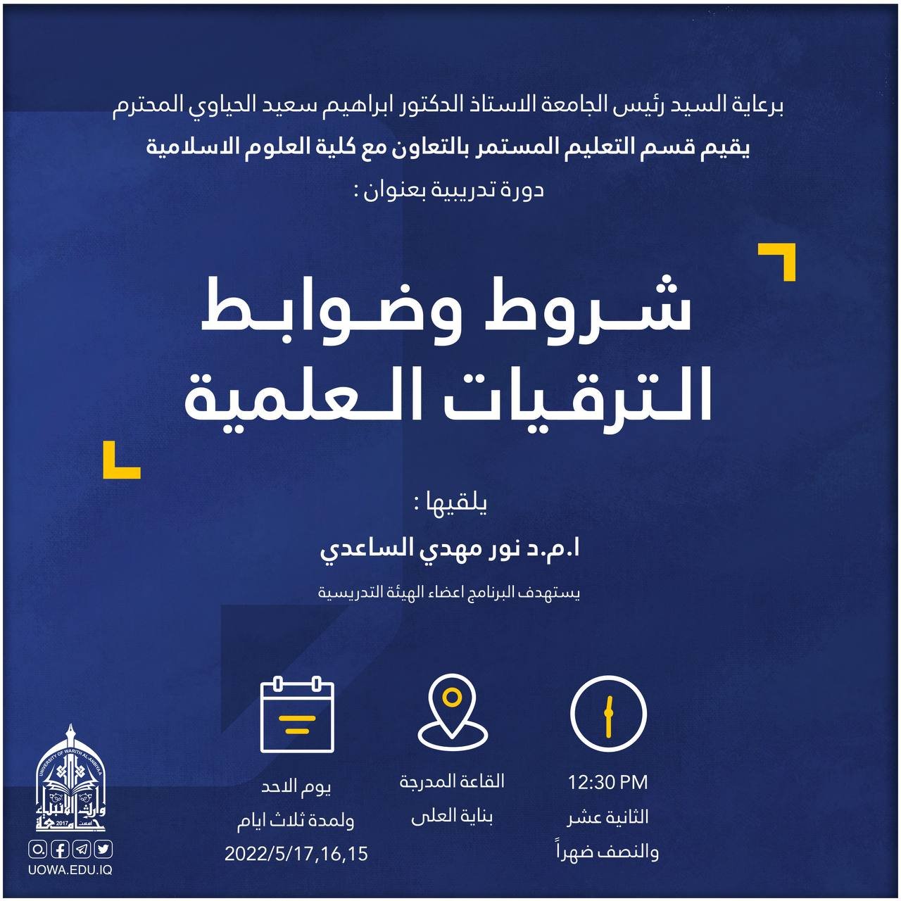برعاية السيد رئيس الجامعة المحترم يقيم قسم التعليم المستمر بالتعاون مع كلية العلوم الإسلامية في جامعة وارث الانبياء دورة تدريبية حول شروط وضوابط الترقيات العلمية تقدمها أ.م.د. نور مهدي الساعدي