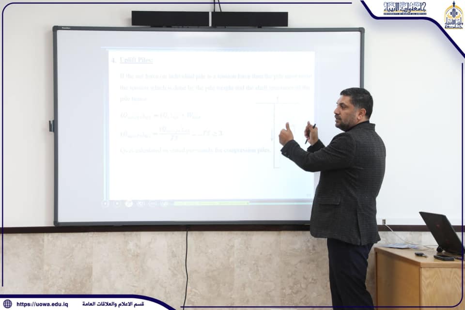 اقام مركز التعليم المستمر وبالتعاون مع كلية الهندسة/قسم الهندسة المدنية دورة تدريبية بعنوان (تصميم وتنفيذ الأساسات العميقة) .وقد تحدث محاضر الدورة المهندس الاستشاري الدكتور حسين هادي رئيس قسم الهندسة المدنية قائلاً:جائت هذه الدورة لتعريف المشتركين بأهمية هذا النوع من الاساسات والتي اصبحت ضرورية في هذا الوقت نتيجة التطور العمراني في مجال بناء الجسور ومحطات الطاقة والابنية متعددة الطوابق والتي تحتاج الى أساسات عميقة(piles foundations ) لغرض نقل الأحمال الكبيرة المتولدة من هذه المنشآت الى تربة قوية بواسطة اسس الركائز ، وأضاف هادي :تضمنت الدورة شرح وافي عن انواع الركائز المختلفة وطرق تنفيذها موقعياً سواء كانت الركائز المسبقة الصب او ركائز الحفرحيث تم التطرق الى كيفية تصميم وتحليل هذا النوع من الاساسات من خلال استخدام الطرق التقليدية ولجميع انواع الركائز ، كما وتم استعراض احد البرامج المهمة في تصميم وتحليل أسس الركائز لغرض مواكبة الطرق الحديثة و المتطورة في طريقة التصميم ، وانه ستكون هناك دورات اخرى في كيفية إجراء جميع الفحوصات الحقلية المطلوبة لاسس الركائز وكيفية تقييم قابلية تحملها باستخدام طرق مختلفة .