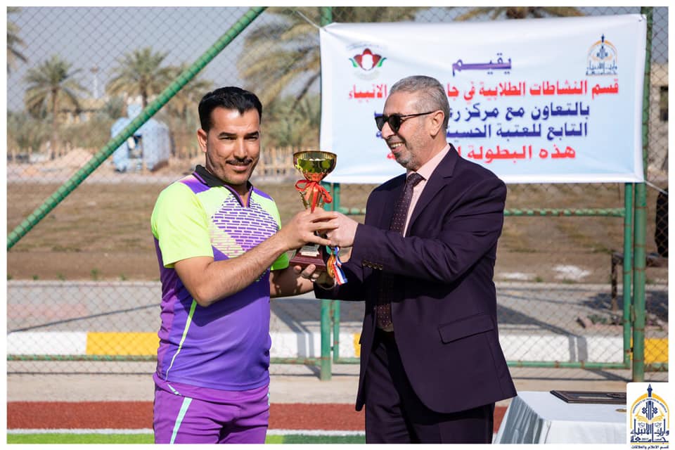 اقام قسم النشاطات الطلابية في جامعة وارث الانبياء(عليه السلام) بطولة الاحرار الرياضية لخماسي الكرة بالتعاون مع مركز رعاية الشباب التابع للعتبة الحسينية المقدسة بمشاركة كليات واقسام الجامعة ، وعن هذه البطولة تحدث السيد رئيس قسم الانشطة الطلابية الدكتور همام الخفاجي قائلاً :افتتحت بطولة الأحرار لخماسي كرة القدم بقراءة سورة الفاتحة على أرواح شهداء العراق كافة ، وكانت بمشاركة 17 فريق من كافة كليات واقسام الجامعة، واعتمدت البطولة نظام التسقيط الفردي للوصول الى النهائيات.واضاف الخفاجي:اقيمت هذه البطولة لاعتبارها جانب ترفيهي يُخرِج الطلبة من روتين الدراسة الى فسحة رياضية تنافسية تتكلل بالتتويج وتقديم الهدايا للفرق الفائزة بالمراتب الأولى فضلا عن تكريم افضل لاعب وافضل حارس مرمى.يذكر ان جامعة وارث الانبياء (عليه السلام) تقيم في كل عام بطولات عديدة بكرة القدم وكرة الطاولة وغيرها من النشاطات الرياضية لطلبتها الاعزاء.