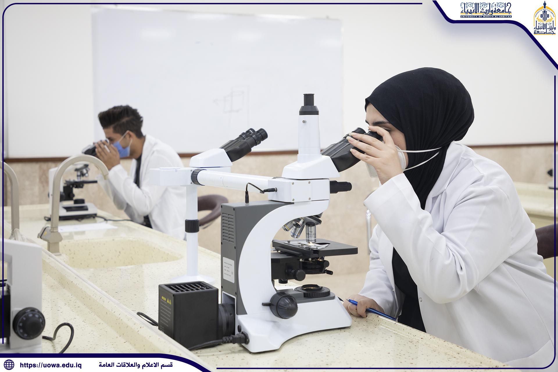 طلبة كلية الطب في جامعة وارث الأنبياء(عليه السلام) يتلقون محاضراتهم في المختبرات العلمية ، وأداء بعض التجارب الطبية المختبرية بإشراف مباشر من قبل عميد الكلية الأستاذ الدكتور فالح البياتي والسادة اعضاء هيئة التدريس ، حيث حرصت رئاسة الجامعة على توفير افضل المعدات والاجهزة المختبرية الحديثة للتدريس العملي في الكلية، مع التأكيد على الإلتزام بالاجراءات الوقائية الصحية وارتداء الكمامات للوقاية من عدوى الجائحة.
