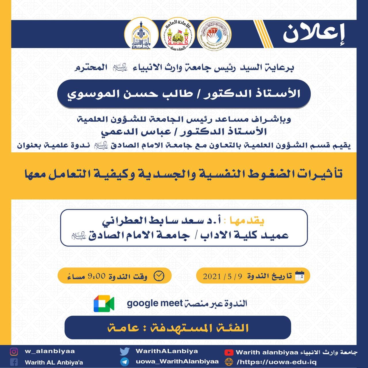 للمشاركة في الندوة يرجى الضغط على الرابط ادناه: https://meet.google.com/hqm-txan-pvk