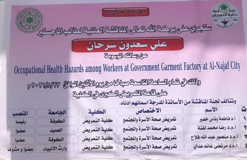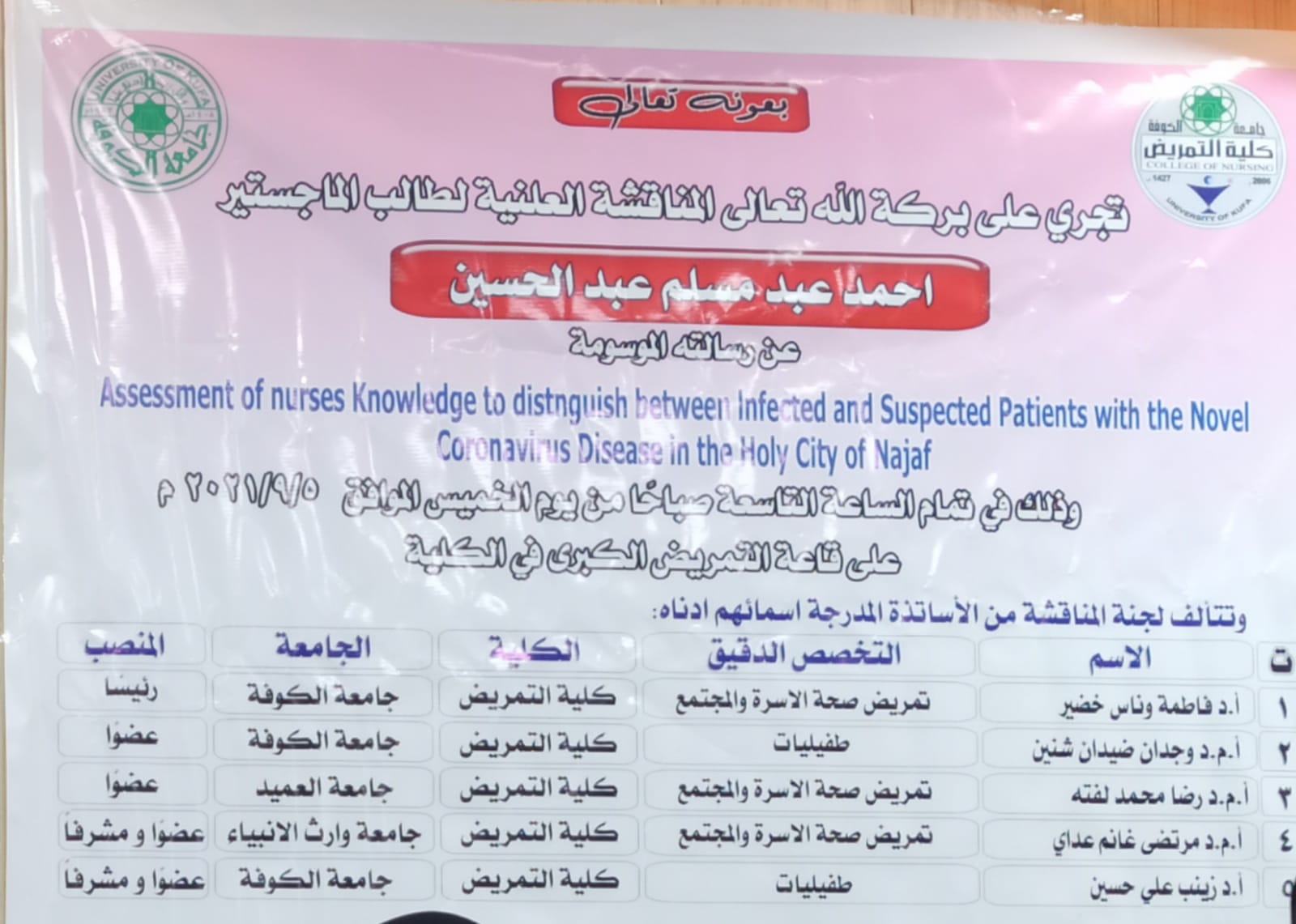 اشرف الاستاذ المساعد الدكتور مرتضى غانم الجبوري عميد كلية التمريض على طالب الدراسات العليا احمد عبد مسلم من جامعة الكوفة حيث تمت المناقشة تمام الساعة التاسعة صباحا من يوم الخميس الموافق 5\9\2021 على قاعة التنمريض الكبرى في كلية التمريض