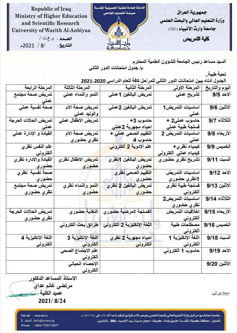 طلبتنا الاعزاء... الجدول الامتحاني الخاص بالامتحانات النهائية في كلية التمريض للعام الدراسي 2021-2022