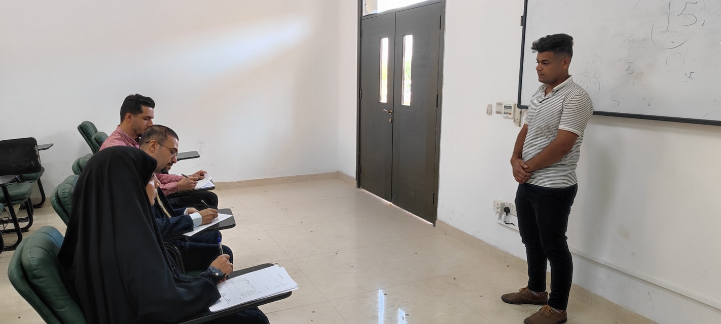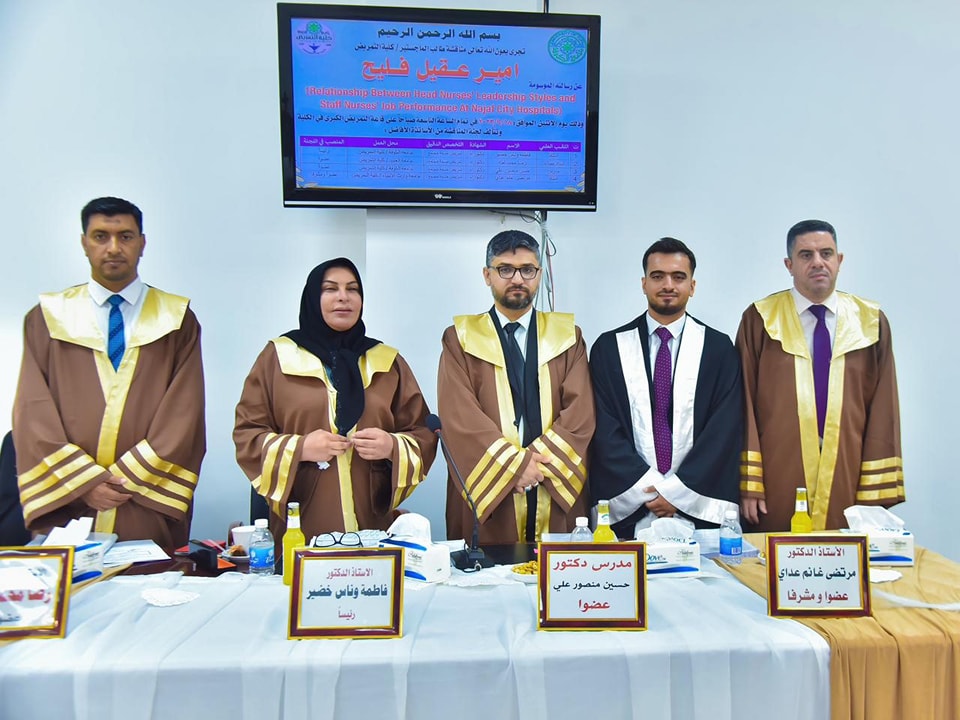 الاستاذ الدكتور مرتضى غانم الجبوري عميد كلية التمريض في جامعة وارث الانبياء مشرفًا على طالب ماجستير امير عقيل برسالته الموسومه العلاقه بين اساليب القياديه و اداء الكادر التمريضي في مستشفيات مدينة النجف الأشرف