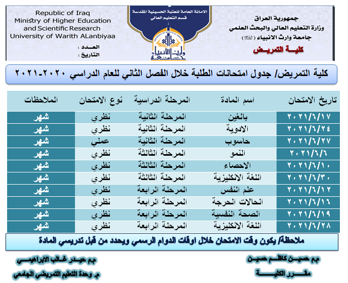 استمرار اختبار الطلبة في اسبوع الامتحانات النهائية العملية للمواد الاساسية في كلية التمريض مع اتخاذ كافة الاجراءات الوقائية اللازمة.