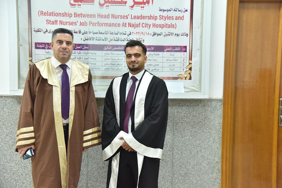 الاستاذ الدكتور مرتضى غانم الجبوري عميد كلية التمريض في جامعة وارث الانبياء مشرفًا على طالب ماجستير امير عقيل برسالته الموسومه العلاقه بين اساليب القياديه و اداء الكادر التمريضي في مستشفيات مدينة النجف الأشرف