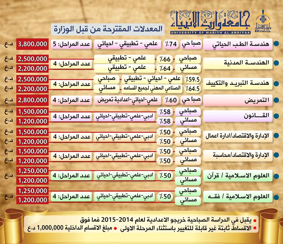 #جامعة_وارث_الأنبياء التابعة للعتبة الحسينية المقدسة ترحب بطلبتها الأعزاء الراغبين بالتسجيل في الجامعة أعزائنا طلبة السادس الإعداديسارعوا بالحصول على مقعد دراسي في جامعة وارث الأنبياء في كلياتها وأقسامها علما ان مدة التقديم ١٠ ايام فقط: ١.كلية الهندسه بأقسامها:-قسم الهندسة المدني -قسم هندسة طب الحَيَاة -هندسة تقنيات التبريد والتكييف ٢.كلية التمريض ٣.القانون ٤.كلية الادارة والأقتصاد -قسم ادارة الاعمال  -قسم المحاسبة ٥.كلية العلوم الإسلامية -قسم علوم القران -قسم الفقه وأصوله