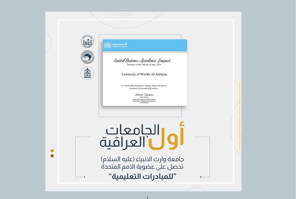 حققت جامعة وارث الأنبياء (عليه السلام) إنجازًا متميزًا بحصولها على عضوية منظمة الأمم المتحدة الأكاديمية (lmpact) في مجال المبادرات التعليمية، خصوصًا في مجالي التنمية المستدامة والبحث العلمي.