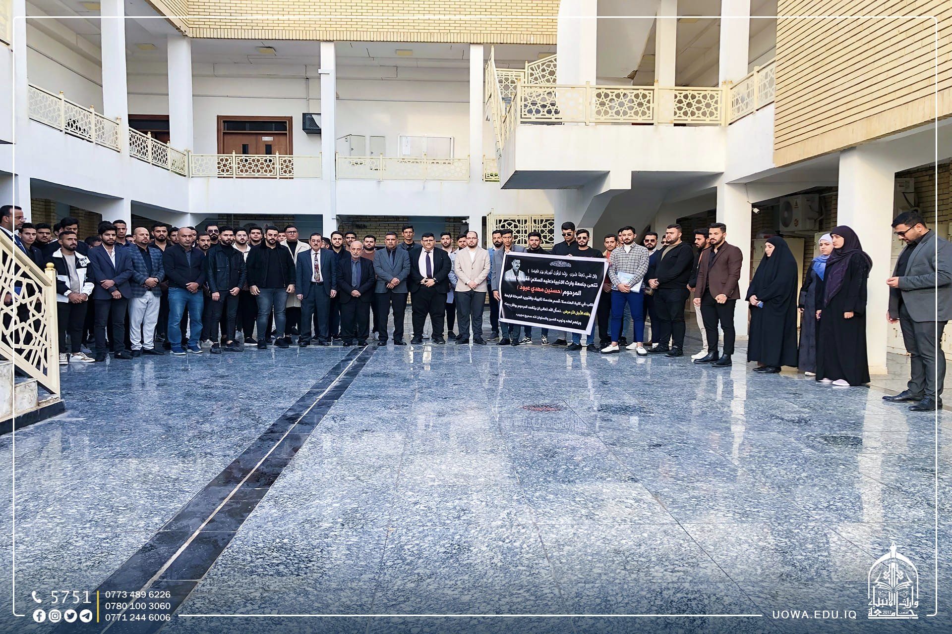 عمادة وطلبة كلية الهندسة ينظمون وقفة حداد وقراءة سورة الفاتحة على روح المرحوم الشاب (حسنين مهدي عبود) الطالب في قسم هندسة تقنيات التكييف والتبريد المرحلة الرابعة ، سائلين الله (عز وجل) ان يتغمده برحمته الواسعة ،ويلهم ذويه الصبر والسلوان.
