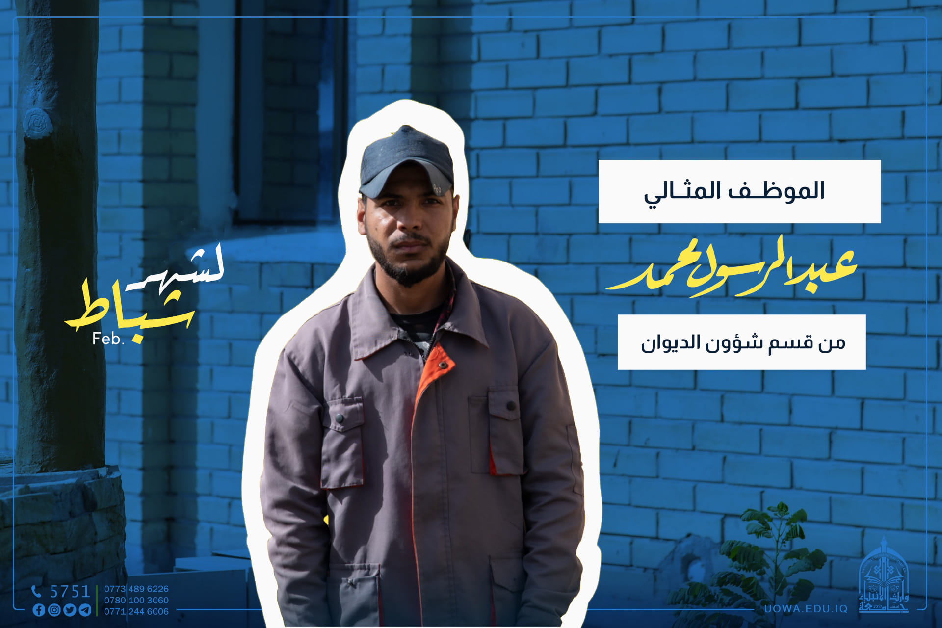 اختيار الموظف المتميز في الجامعة، وهو الموظف (عبد الرسول محمد عبد الرسول) في قسم ديوان الجامعة لتفانيه واخلاصه في أداء عمله بالشكل الأمثل، متمنين له الموفقية والمزيد من العطاء لخدمة هذه الجامعة