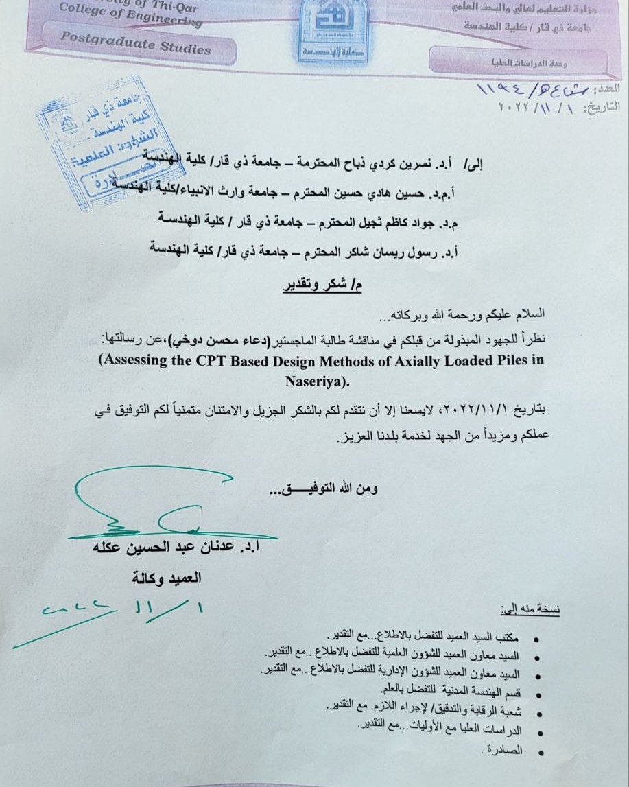 اختيار عميد كلية الهندسة في جامعة وارث عضواً في لجنة مناقشة رسالة ماجستير