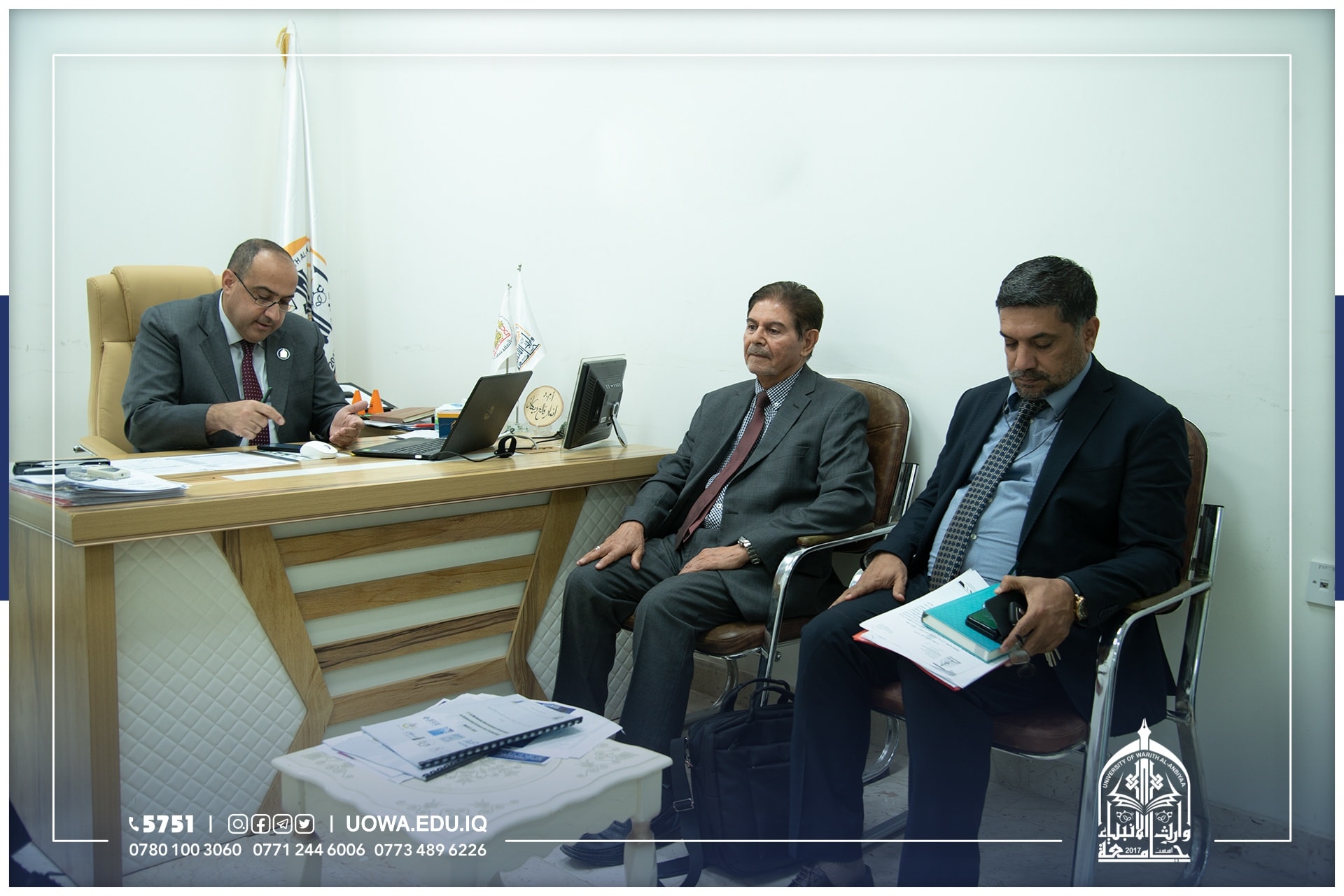 اجتمع السيد رئيس الجامعة الاستاذ الدكتور ابراهيم الحياوي بالبروفيسور حسن النجم رئيس مركز تطوير المواد الانشائية في جامعة ليفربول جون مورس البريطانية والسيد عميد كلية الهندسة الدكتور حسين هادي والسيد رئيس قسم الشؤون العلمية والسيد رئيس قسم ضمان الجودة