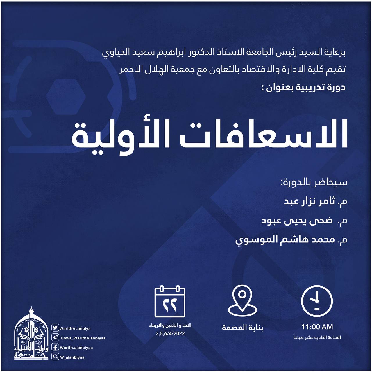 برعاية رئيس الجامعة الاستاذ الدكتور ابراهيم الحياوي نظمت كلية الادارة والاقتصاد في جامعة وارث الأنبياء (عليه السلام) وبالتعاون مع جمعية الهلال الأحمر دورة تدريبية بعنوان " الاسعافات الأولية "يحاضر فيها كل من