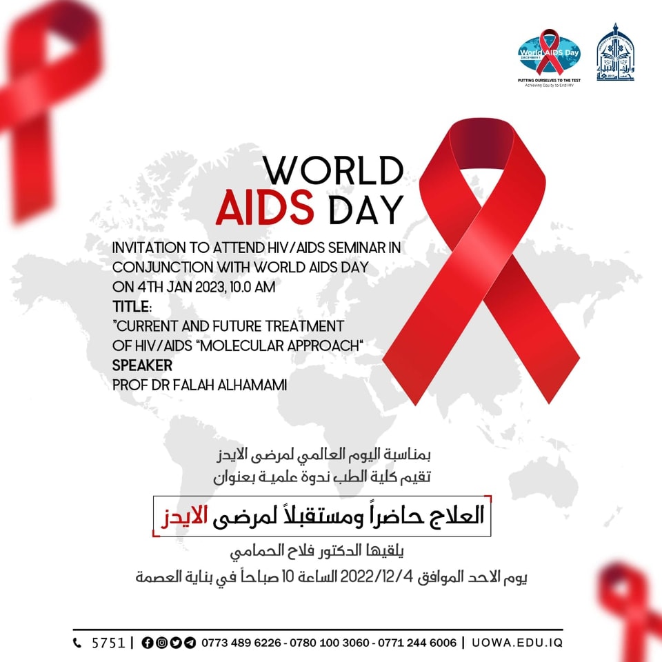 تقيم كلية الطب في جامعة وارث الأنبياء (عليه السلام) ندوة علمية بعنوان "العلاج حاضراً ومستقبلاً لمرضى الايدز"، يقدمها الدكتور فلاح الحمامي، اليوم الاحد الموافق 4/12/2022 في تمام الــــــ (10:00) صباحاً في مبنى العصمة .