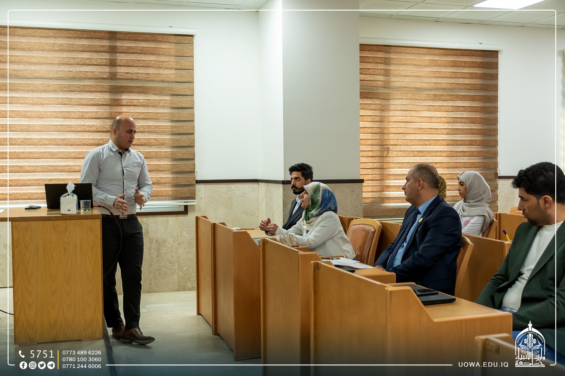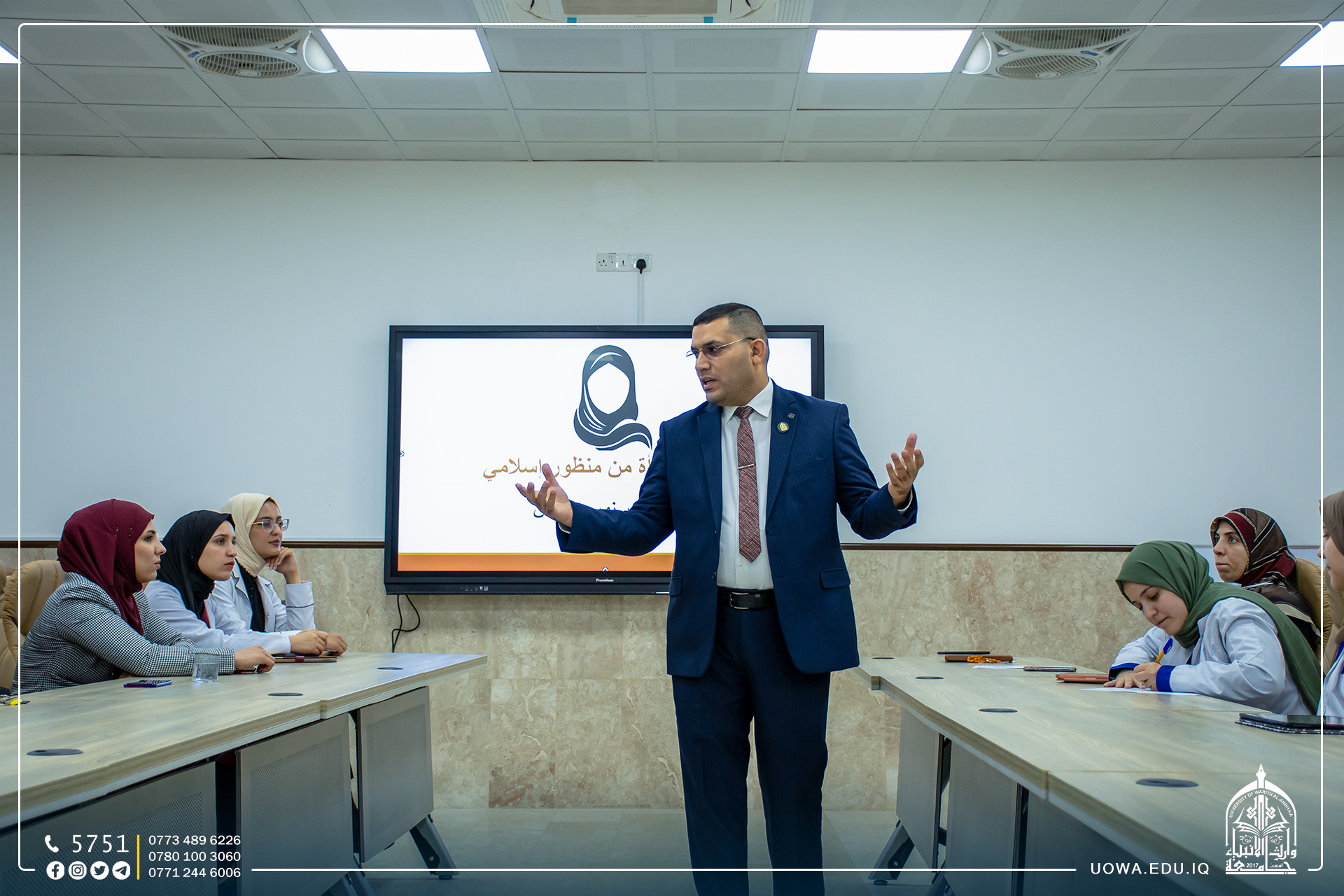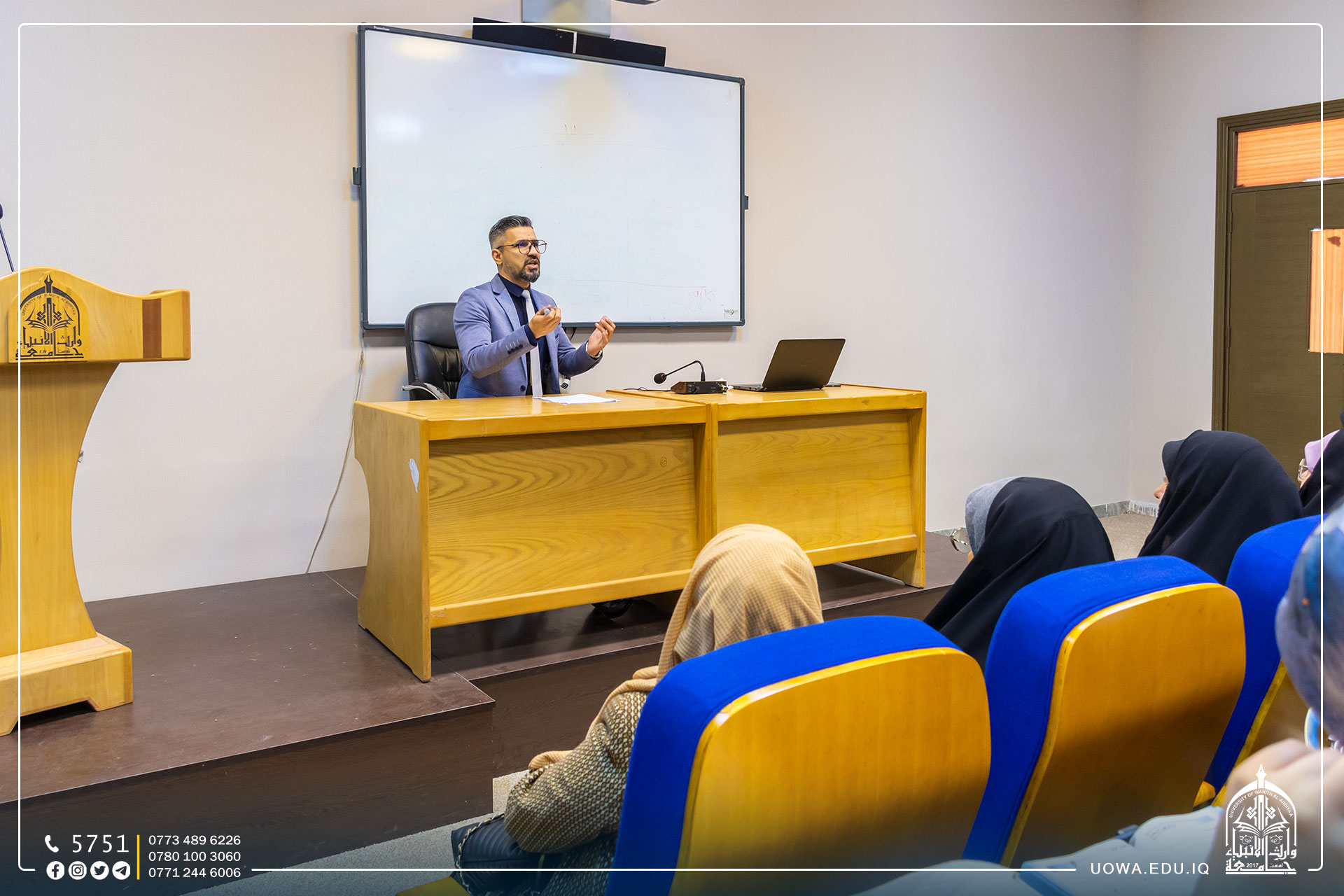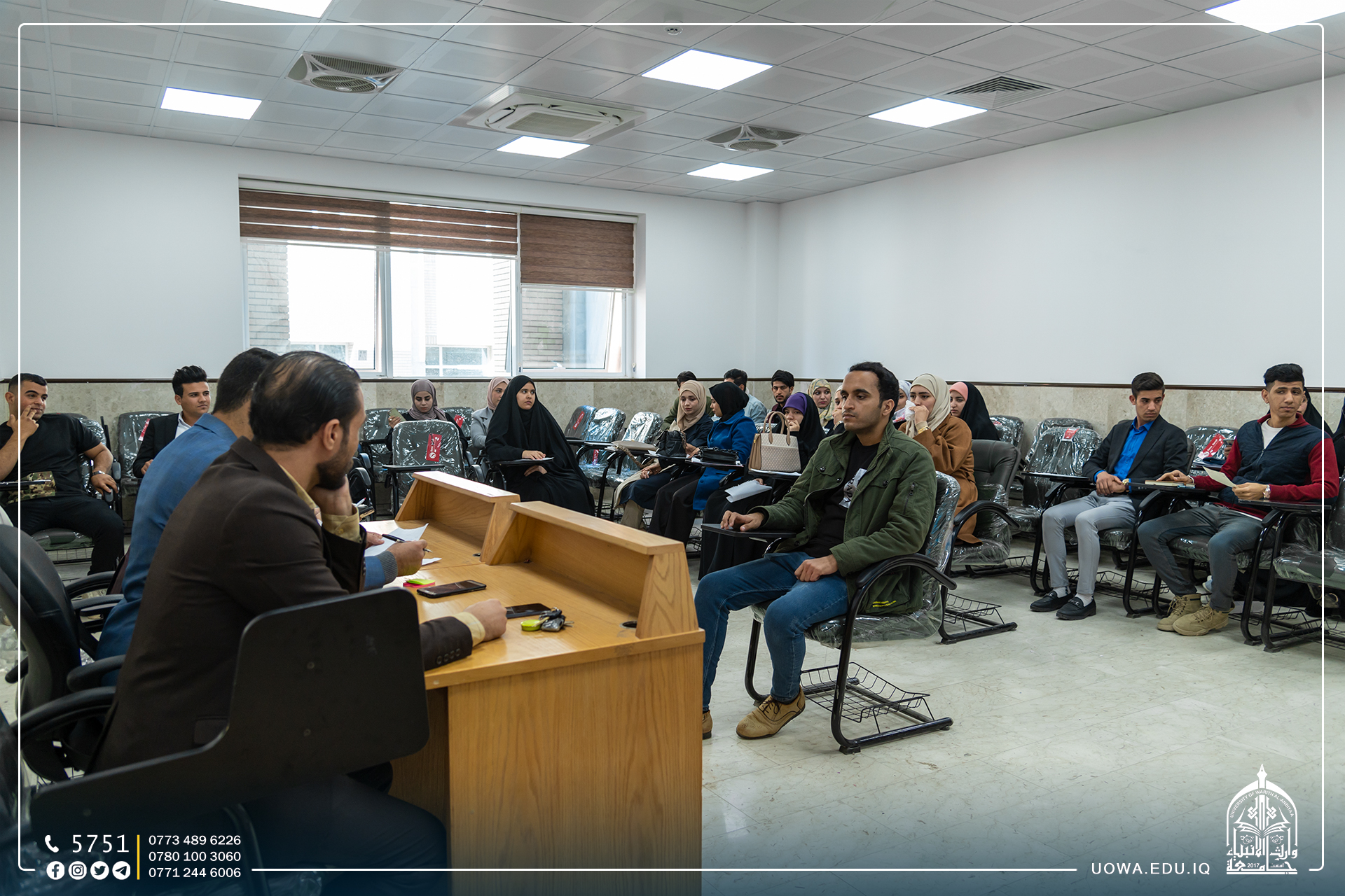 حلقة نقاشية في جامعة وارث الانبياء(عليه السلام) اقامها قسم الشؤون العلمية / وحدة تمكين المراة تحت عنوان(التغيير بين بيئة الاعدادية والحياة الجامعية لطلاب المرحلة الاولى)، قدمها المدرس المساعد عبد الامير صبار.