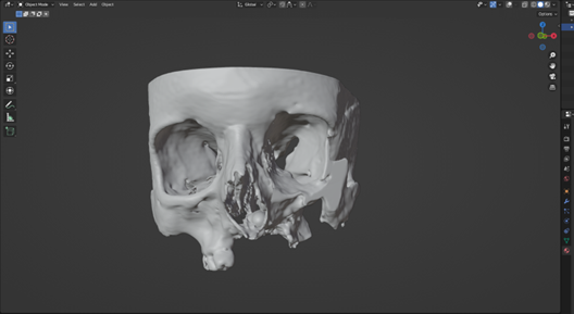 The patient suffered significant trauma to the right side of her face, including partial loss of her right eye, a laceration to the upper jaw, and damage to the orbital floor. Through detailed CT scan analysis and the use of Blender—a professional-grade 3D design software—the medical engineering team reconstructed the affected facial structure and designed a highly accurate, patient-specific implant to restore both functionality and appearance.