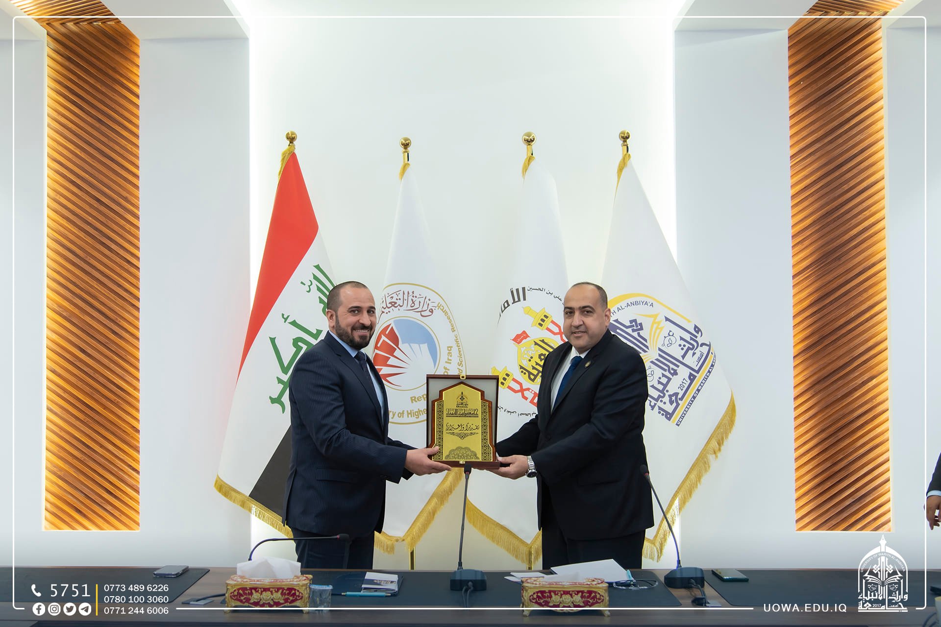 In execution of the terms of the scientific agreement between University of Warith Al-Anbiyaa and the Technological University, Professor Dr. Ibrahim Al-Hayawi, the President of the University, received a delegation from the Presidency of the Technological University, led by Professor Dr. Ahmed Al-Ghaban, the University President. This visit was aimed at enhancing the scientific collaboration between the two universities and monitoring the implementation of the agreement's provisions