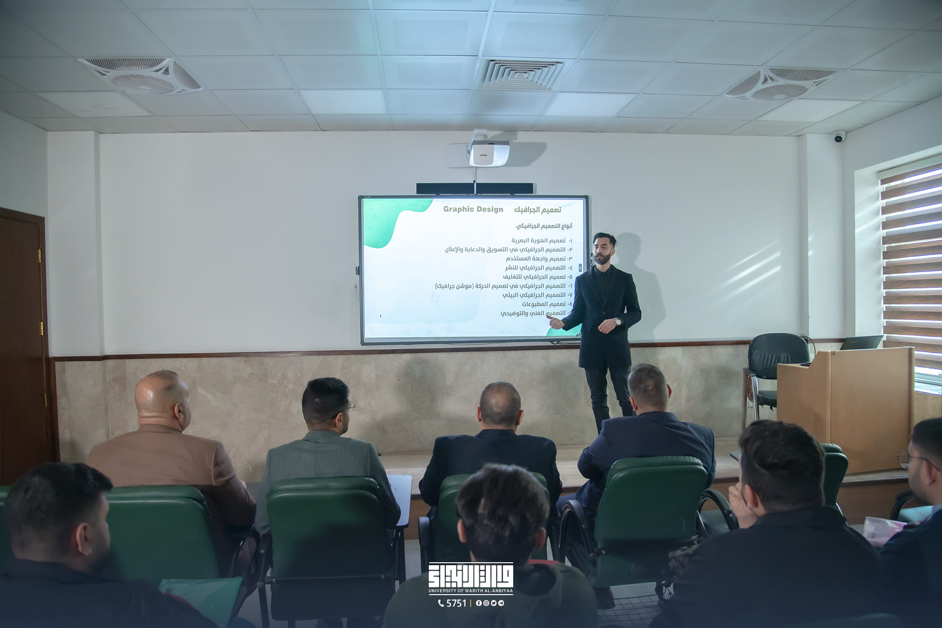 In the presence of Mr. Ibrahim Al-Hayawi, the University President, and Dr. Mohamed Jamal Al-Taif, the Dean of the College of Media, the Department of Digital Media at the College of Media, in collaboration with the Media Department at the Holy Hussainiya Shrine, organized a scientific workshop titled "Digital Design Using Artificial Intelligence Techniques" presented by designer Osama Adnan Al-Khayyat from the Media Office of the Holy Hussainiya Shrine.
