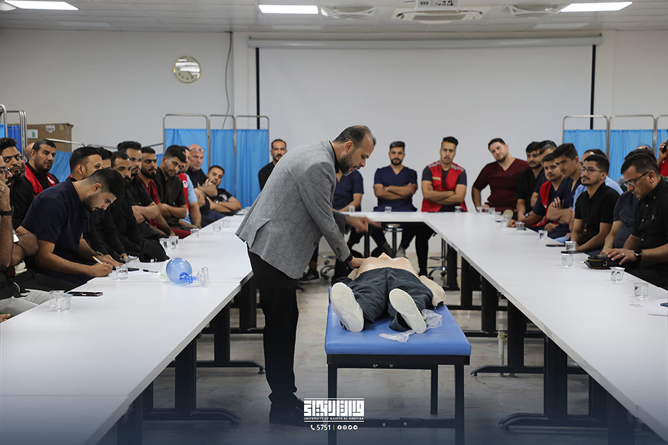 In collaboration with the Regional Centre for Emergency Medicine, the College of Medicine at the University of Warith Al-Anbiyaa (PBUH) arranged a training workshop on advanced first aid (BLS) at the College laboratories. The event was witnessed by the President of the University, Dr. Ibrahim Al-Hayawi, the Dean of the College of Medicine, Dr. Ali Abd Saadoun Al-Ghazi, and the Director of the Centre for Emergency Medicine, Dr. Fadel Okla Al-Rubaie.