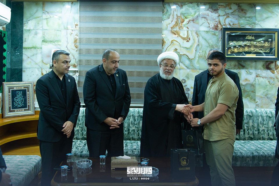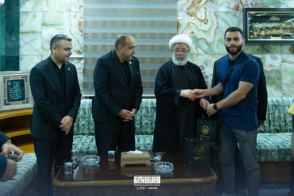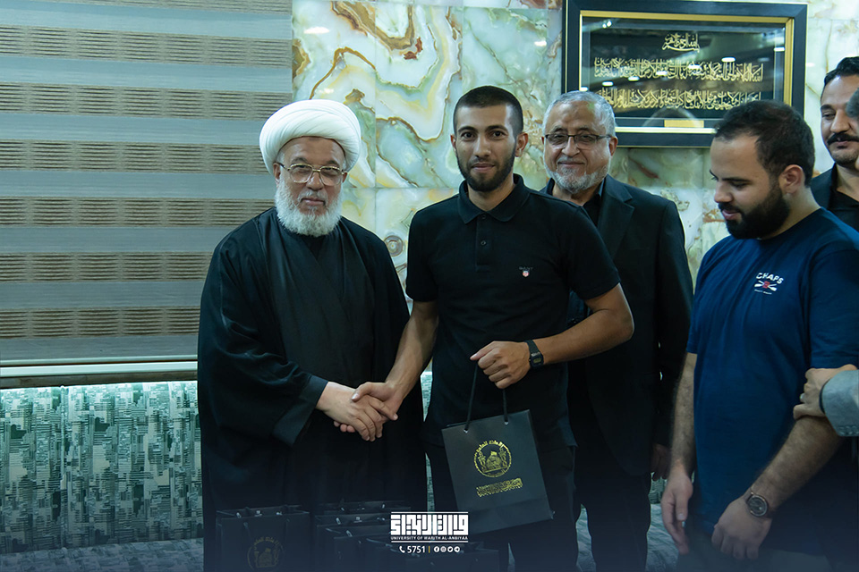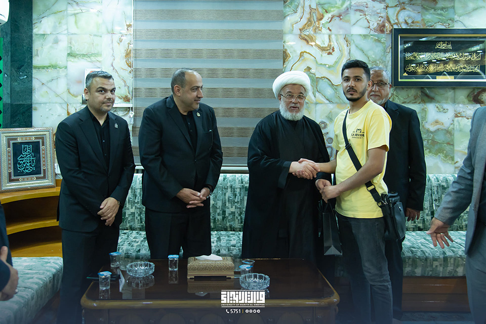 In his office, His Eminence, Sheikh Abdul-Mahdi Al-Karbalai (may his glory last), the legal guardian of the Holy Shrine of Imam Hussein, welcomed Professor Dr. Ibrahim Saeed Al-Hayawi, President of the University of Warith Al-Anbiyaa (PBUH), Professor Dr. Waqid Al-Moussawi, Vice-President of the University for Scientific Affairs, and several Arab guests taking part in the summer training programme.