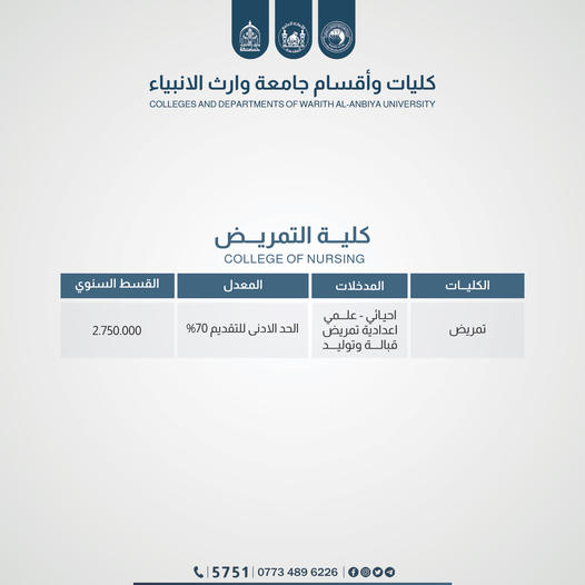 To encourage high-achieving students, the Presidency of the University of Warith Al-Anbiyaa (peace be upon him) announces a 50% reduction in tuition fees for students applying to the Nursing College with GPAs of 80 and above.