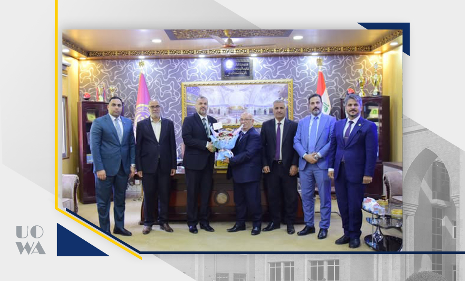 A delegation from Al-Warith Al-Anbiyaa University visited the University of Mosul, headed by Professor Dr. Awwad Al-Khalidi, Dean of the College of Administration and Economics, to sign a scientific cooperation agreement between the two universities.
