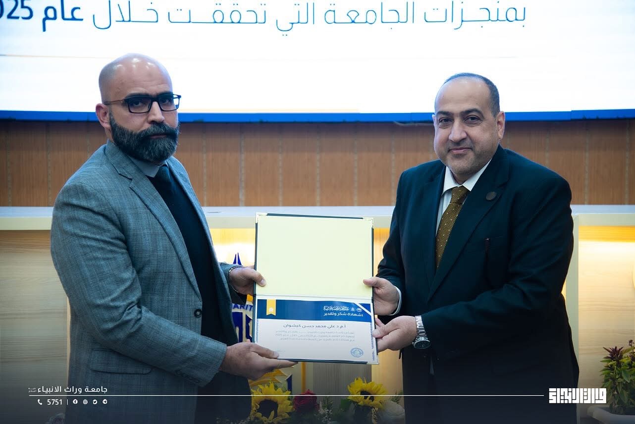 In the presence of the Secretary-General of the Holy Shrine of Imam Hussain, Mr. Hassan Rashid al-Abayji, the Presidency of Warith Al-Anbiyaa University held a celebratory ceremony to honor its distinguished academic achievements for the year 2025.
