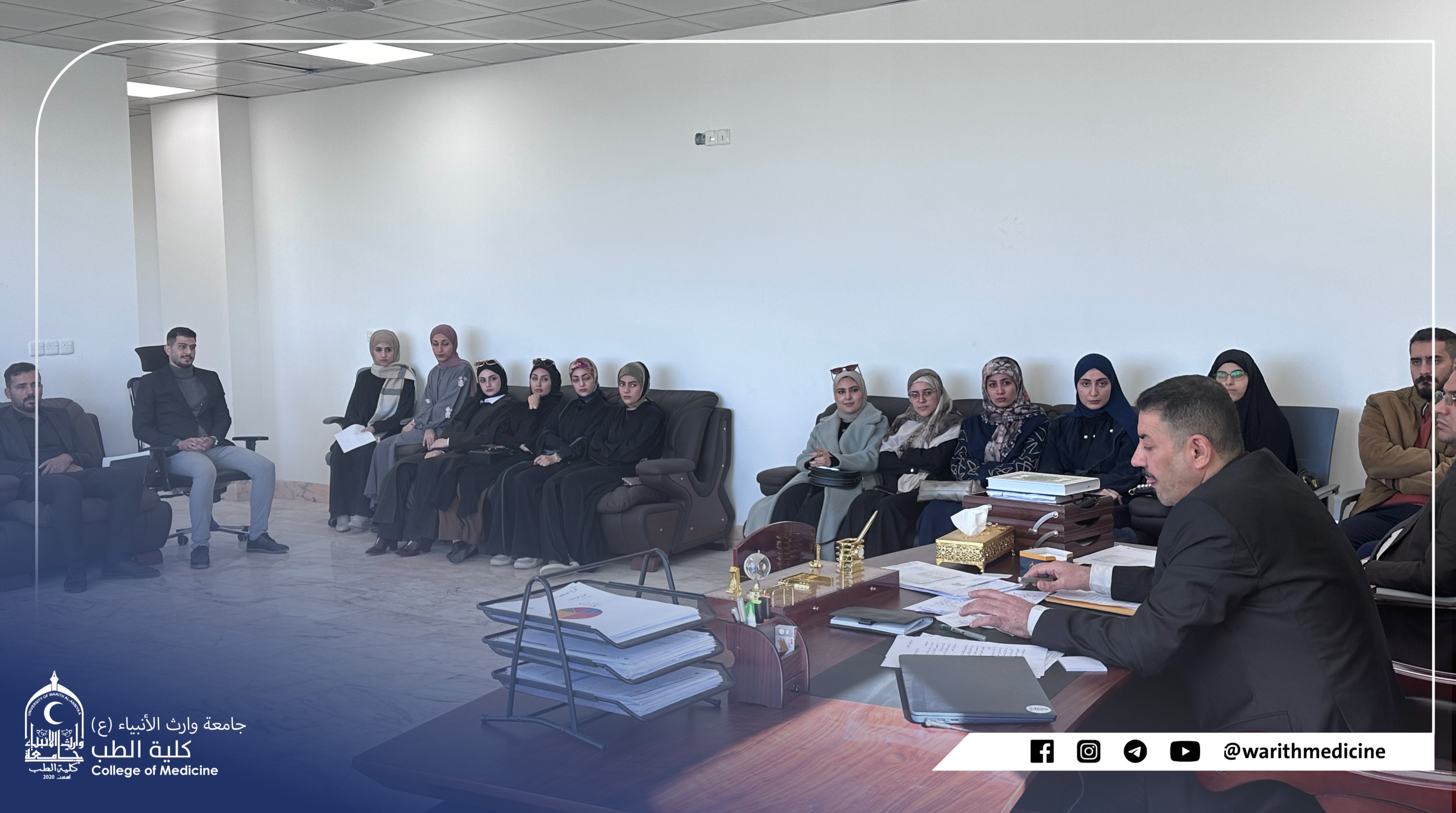 The Honorable Dean of the College of Medicine, Professor Dr. Ali Abd Saadoun Al-Ghazi, the Honorable Assistant Dean for Scientific Affairs, Lecturer Dr. Riyad Haniwa, the Honorable Assistant Dean for Administrative Affairs, Professor Dr. Ali Mansour, the Honorable Director of the Legal Affairs Division, Lecturer Dr. Sabah Al-Jubouri, and the Director of the Medical Education Unit, Lecturer Dr. Ahmed Abdel, met. Respected Muslim, the teaching assistants among the staff of the College of Medicine held the regular meeting to find out the latest developments regarding the work entrusted to them.