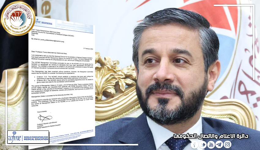 His Excellency, Minister of Higher Education and Scientific Research, Dr. Naeem Abd Yaser Al-Aboudi reviewed that the World Federation for Medical Education (WFME) granted the National Council for Accreditation of Medical Colleges in Iraq (NCAMC) full international accreditation at the level of program evaluation and approved standards in fields within the quality of medical education.