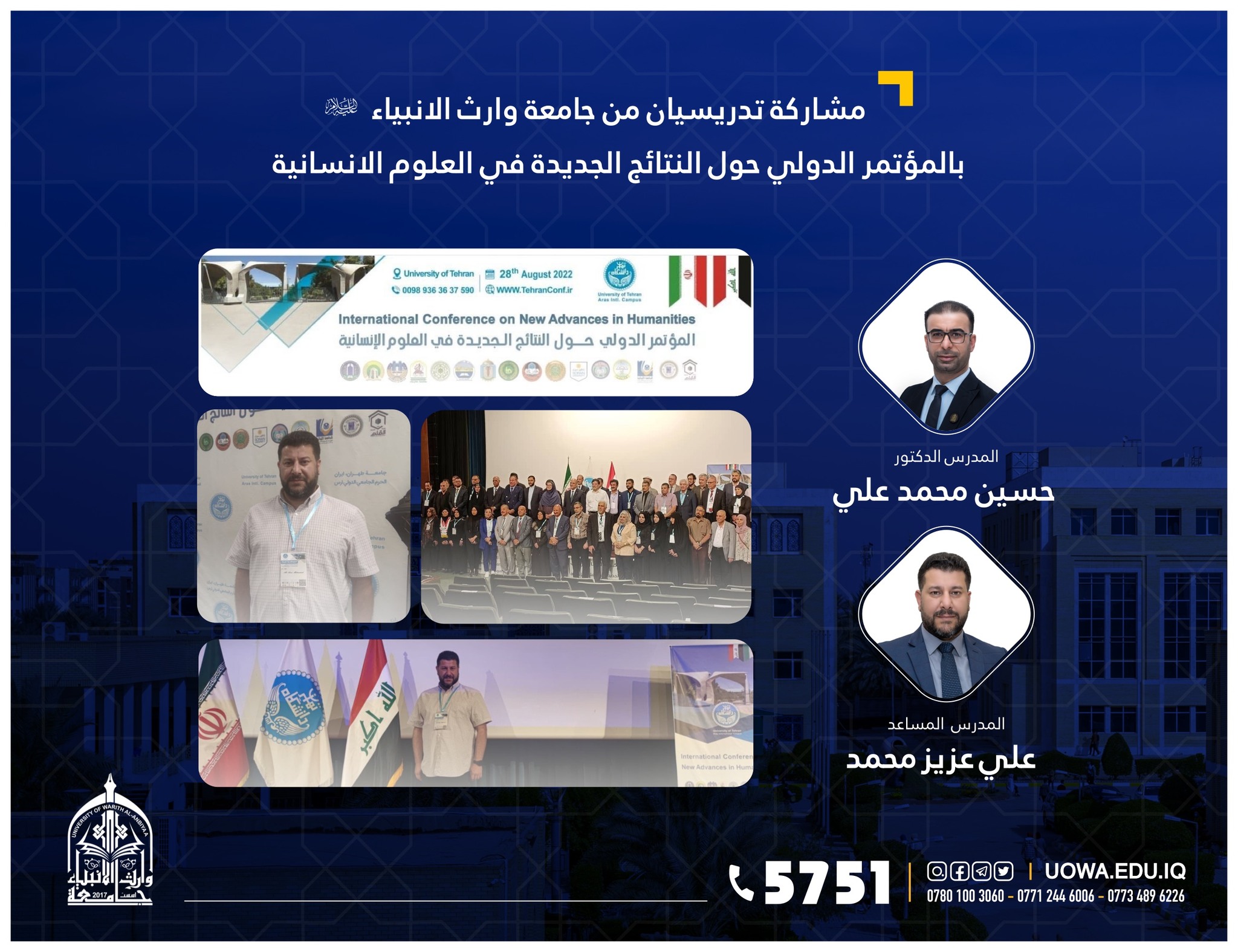 Faculty members from the College of Management and Economics, Department of Business Administration, Mr. Hussein Mohammed Ali and Mr. Ali Aziz Al-Kalkawi, participated in the "International Conference on New Developments in Humanities," hosted by the University of Tehran with wide participation from various Arab and international countries.