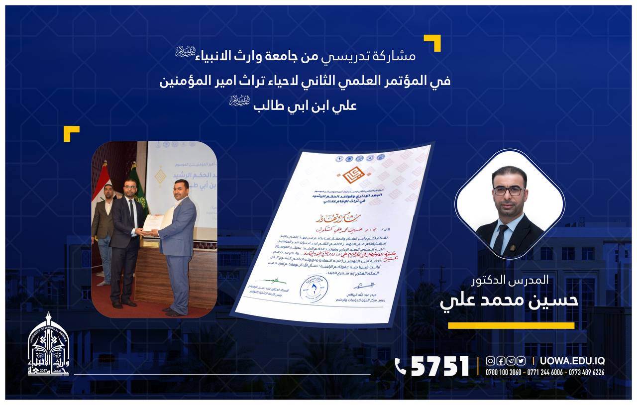 Mr. Hussein Mohammed Ali, a lecturer at the Faculty of Management and Economics, Department of Business Administration at Wraith Al-Anbiyaa University, presented his research titled "The Philosophy of Administrative Insight in the Thought of Imam Ali (peace be upon him) and its Role in Achieving Enlightened Leadership - A Content Analysis Study of the Sermons of Imam Ali (peace be upon him)."