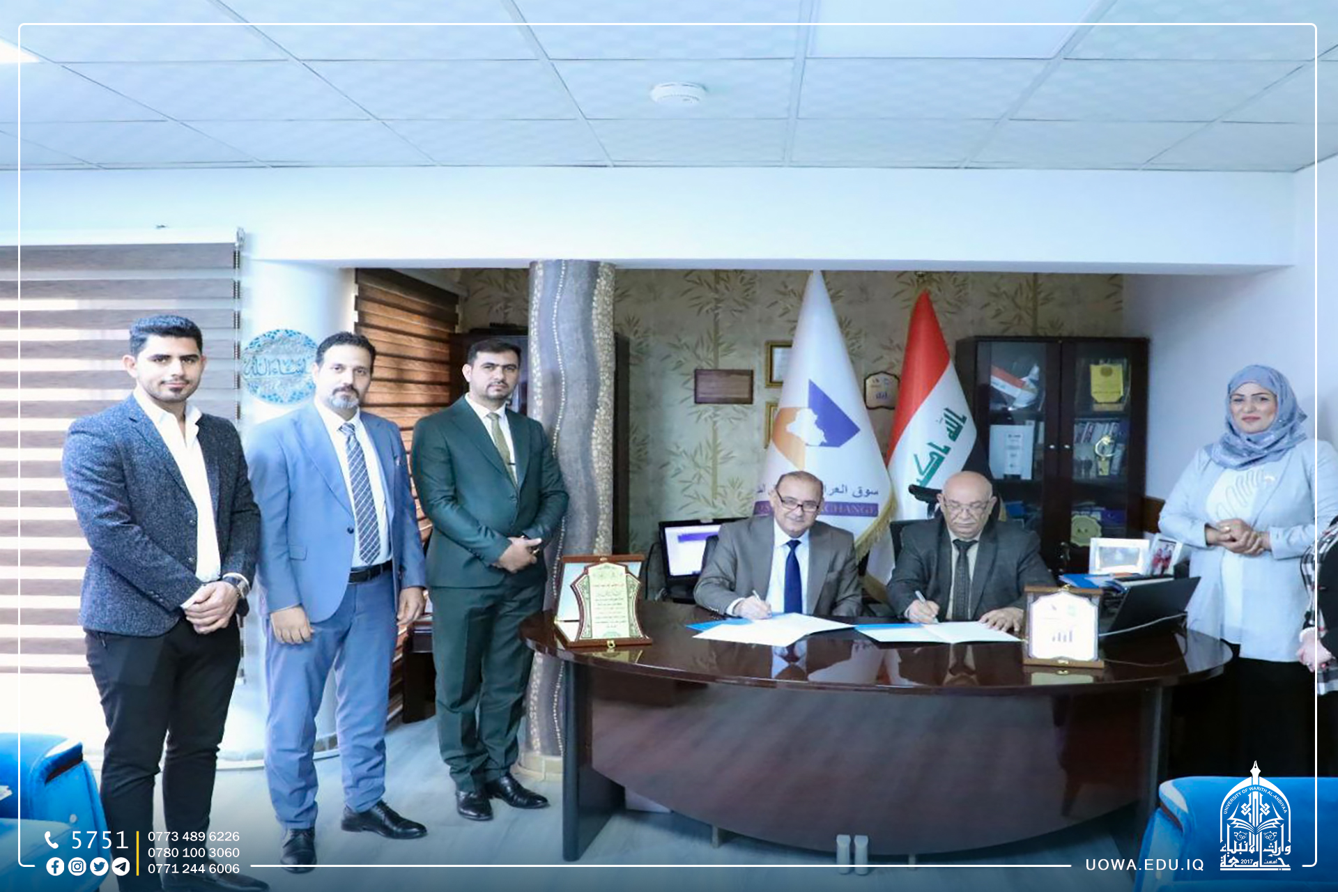The College of Management and Economics, in collaboration with the "Warith Center for Entrepreneurship and Innovation" at the University of Warith Al-Anbiyaa (peace be upon him), entered into a mutual cooperation agreement with the Iraq Stock Exchange. The agreement includes provisions for scientific visits, workshops, and seminars aimed at enhancing the academic level of the college students.